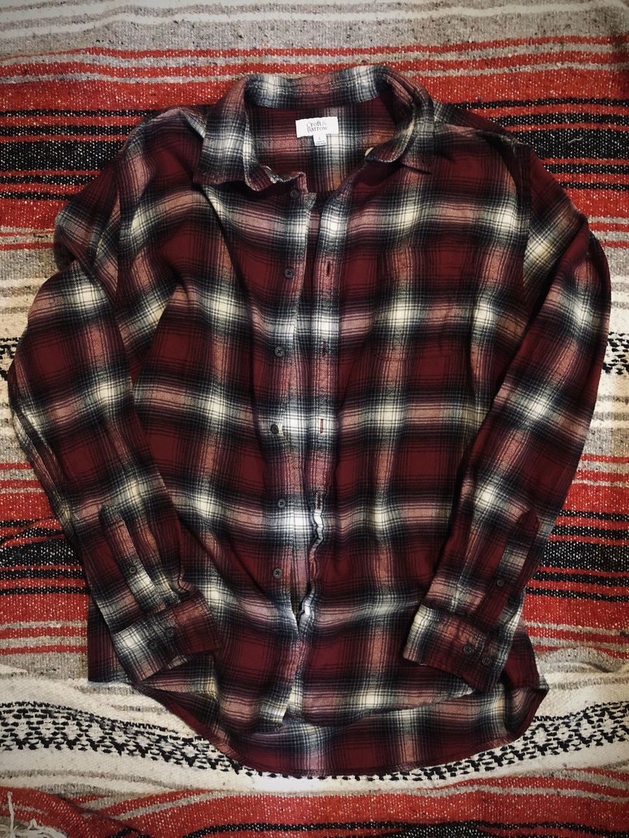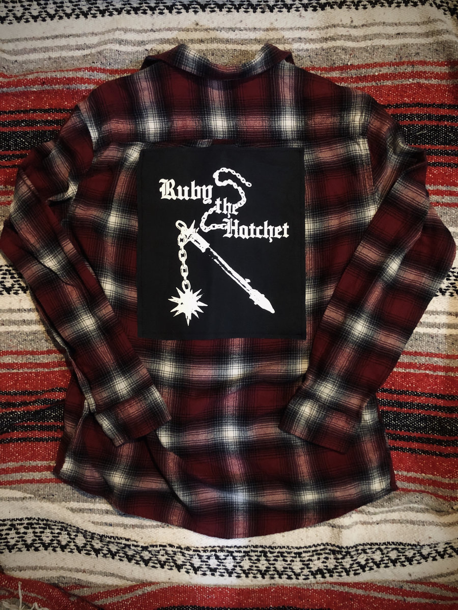 Repurposed patched flannel in deep red / charcoal / neutral colors with our Flail Don't Fail logo sewn on back. This is a rehabbed garment but in good condition. Let us know if it's a gift and we will prioritize shipping !