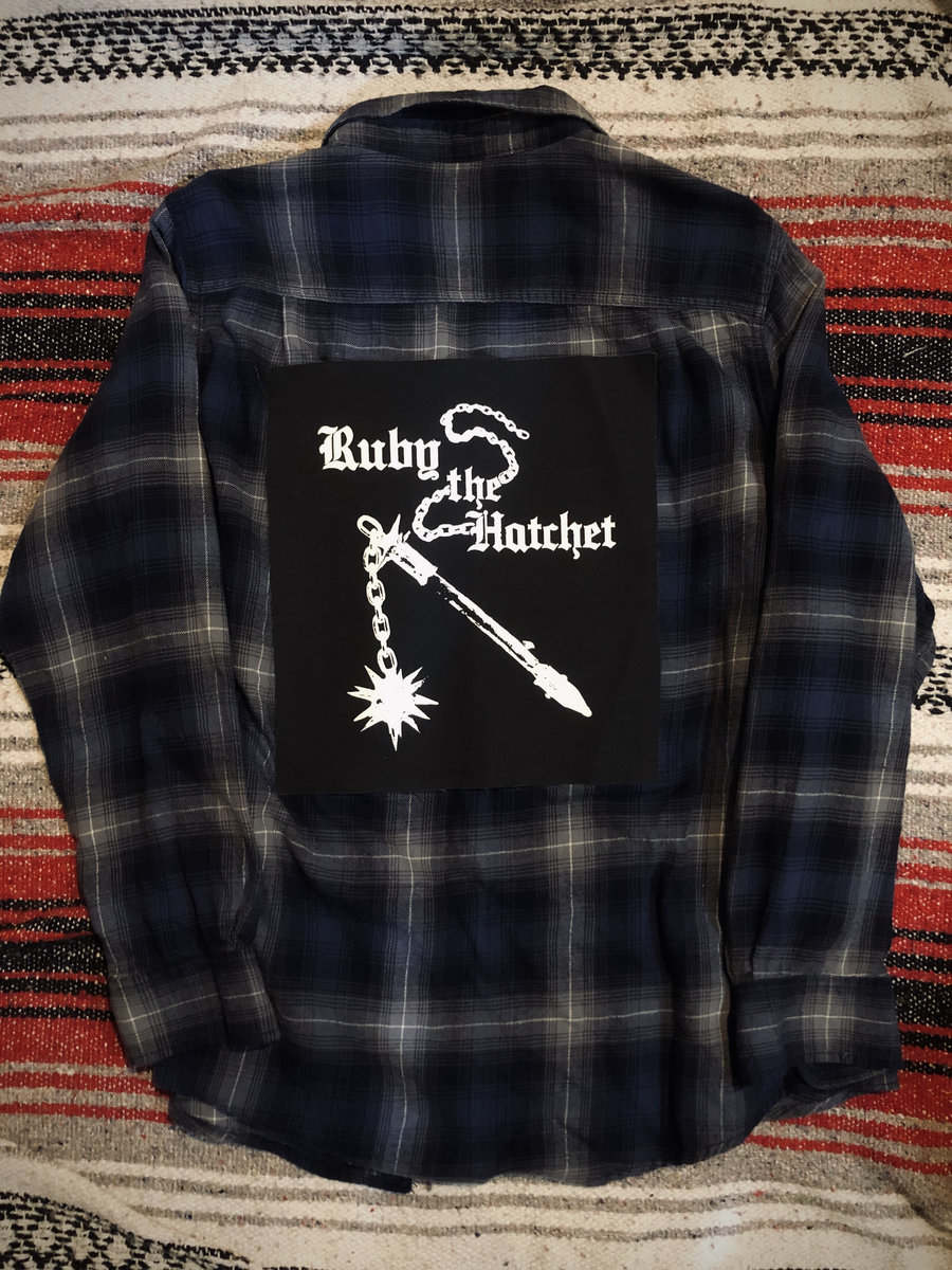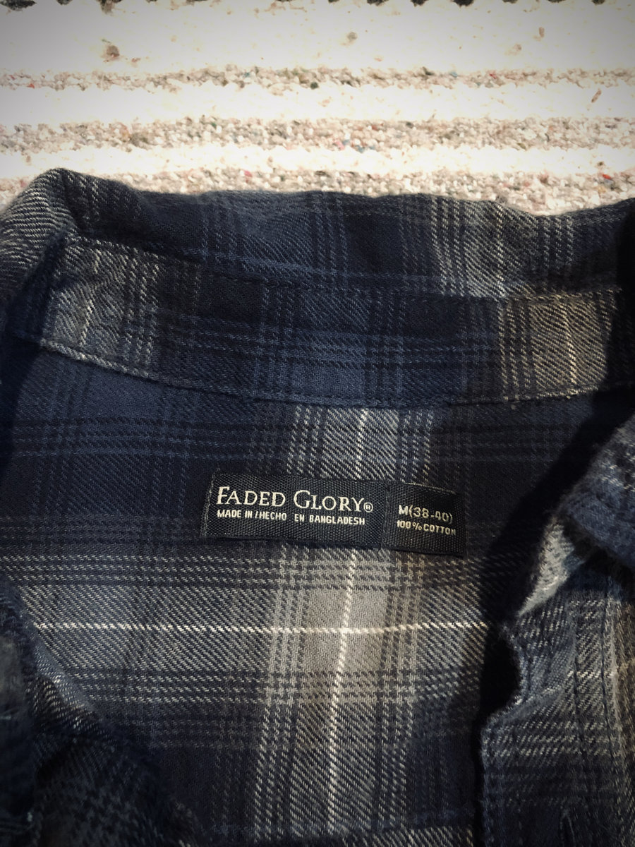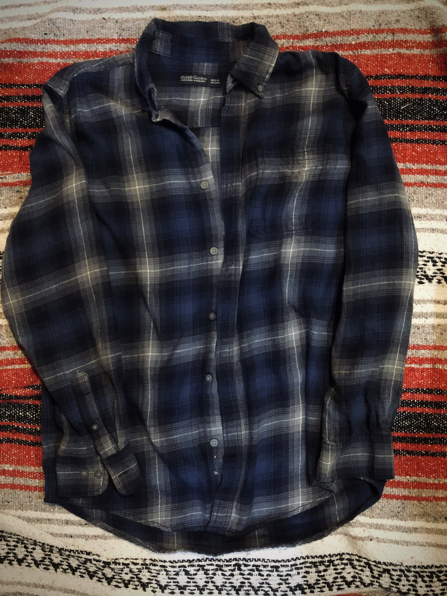 Repurposed patched flannel in navy / charcoal / colors with our Flail Don't Fail logo sewn on back. This is rehabbed but in good condition. Let us know if it's a gift and we will prioritize shipping !